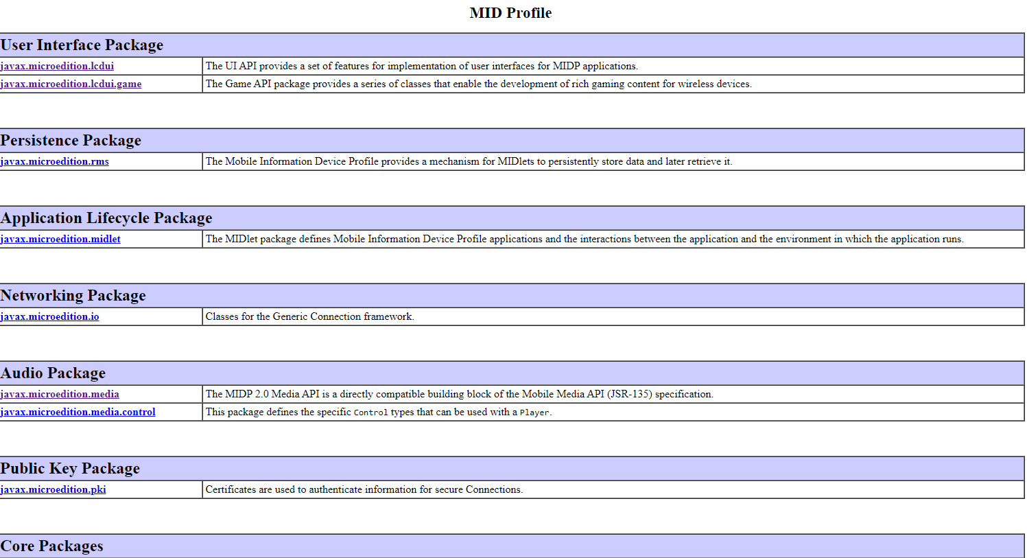 Несмотря на то, что игры под кнопочные телефоны писались на Java, набор API и поддерживаемых пакетов отличался от обычной JVM на ПК, которую использует, например, Minecraft. Всего существует три профиля — J2SE (Android и ПК), J2EE (серверы и энтерпрайз) и J2ME (встраиваемая электроника и телефоны). Однако сам по себе J2ME делится ещё на два стандарта — CLDC/CDC (набор поддерживаемых фишек языком — например, ранние телефоны не поддерживали float) и MIDP (набор поддерживаемых телефоном фишек — работа с дисплеем, проигрывание звуков, доступ в сеть и обработка ввода — всё это часть MIDP). За всё время существования было две версии MIDP — 1.0, которая была весьма ограничена в возможностях (например, нельзя было развернуть игру на весь экран) и использовалась с 2001 по ~2003 год и MIDP 2.0, которая использовалась вплоть до кончины J2ME.
