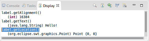 Display – это такая вьюшка (view), которая даёт вам силу использовать отладчик как настоящий ниндзя. Код из вьюшки Display запускается в контексте текущей отладки. Пишем строчку кода, выделяем её, нажимаем Ctrl+U, и код запускается, а нажимаем Ctrl+Shift+V – код не только запускается, но и результат его вызова печатается рядом с нашим кодом в Display. Помимо этого, выделенный текст можно отправить в Watch Expressions. Все эти действия также имеются на панели инструментов вьюшки.