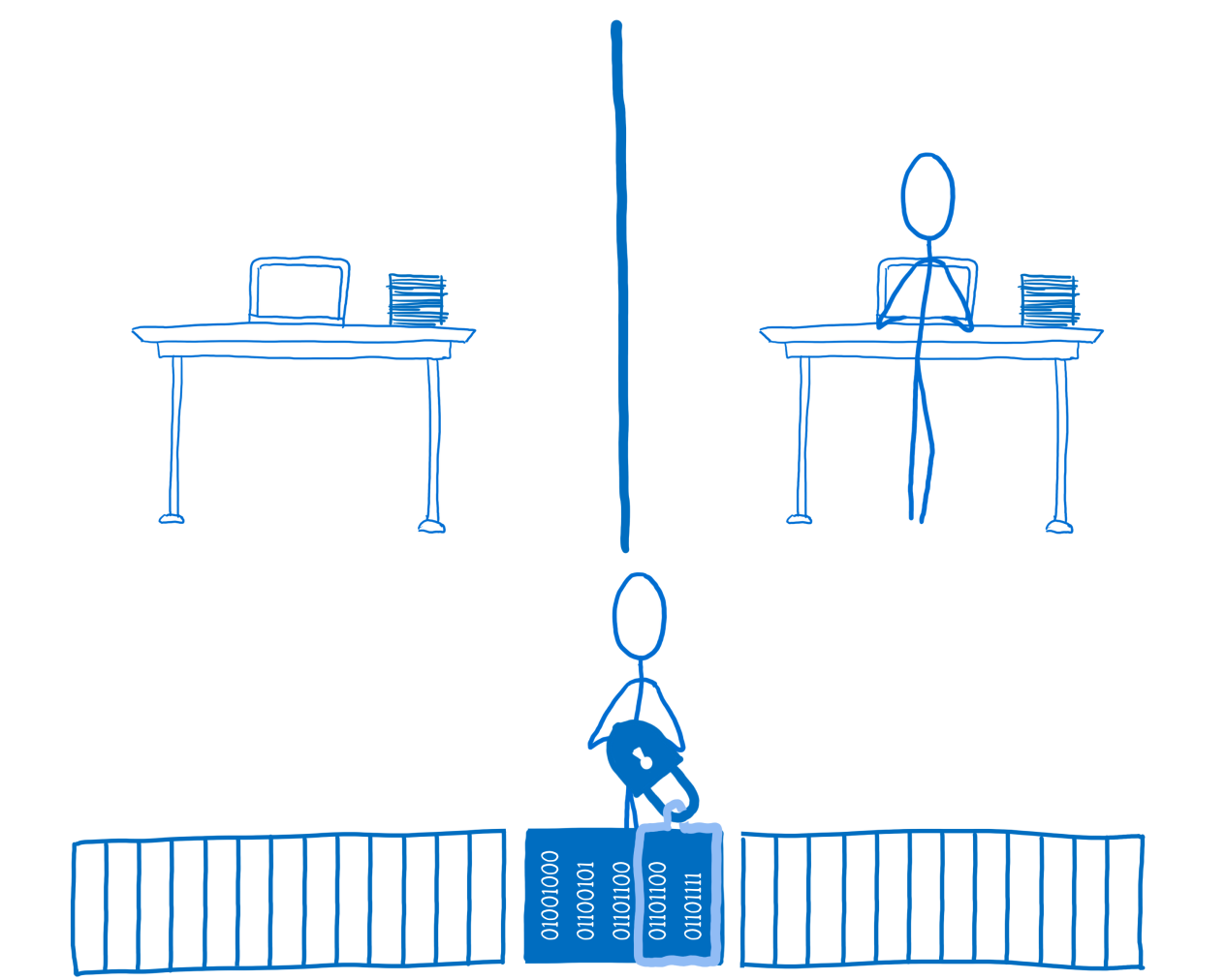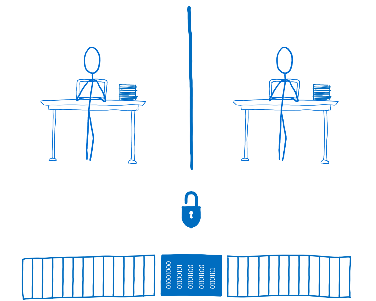 Если код хочет использовать общие данные, он должен захватить блокировку. На рисунке выше ни один из потоков не заблокировал общую область памяти, это представлено в виде открытого замка. После захвата поток может использовать блокировку для защиты данных от других потоков. Только он может получить доступ к этим данным или изменить их, пока блокировка активна.