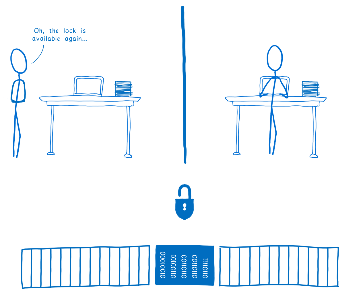 Если потоку №1 нужен доступ к данным, он попытается захватить блокировку. Но так как блокировка уже используется, сделать он этого не сможет. Поэтому потоку придётся ждать до тех пор, пока данные не окажутся разблокированными.