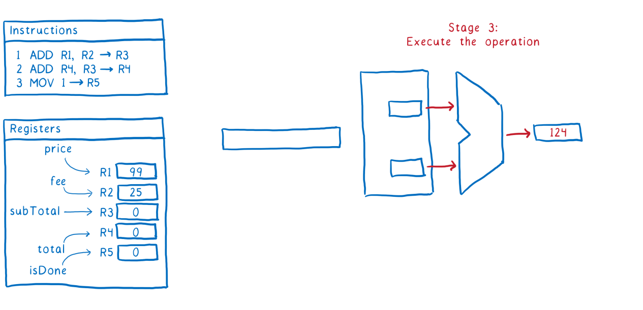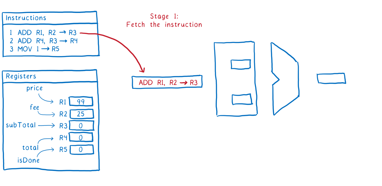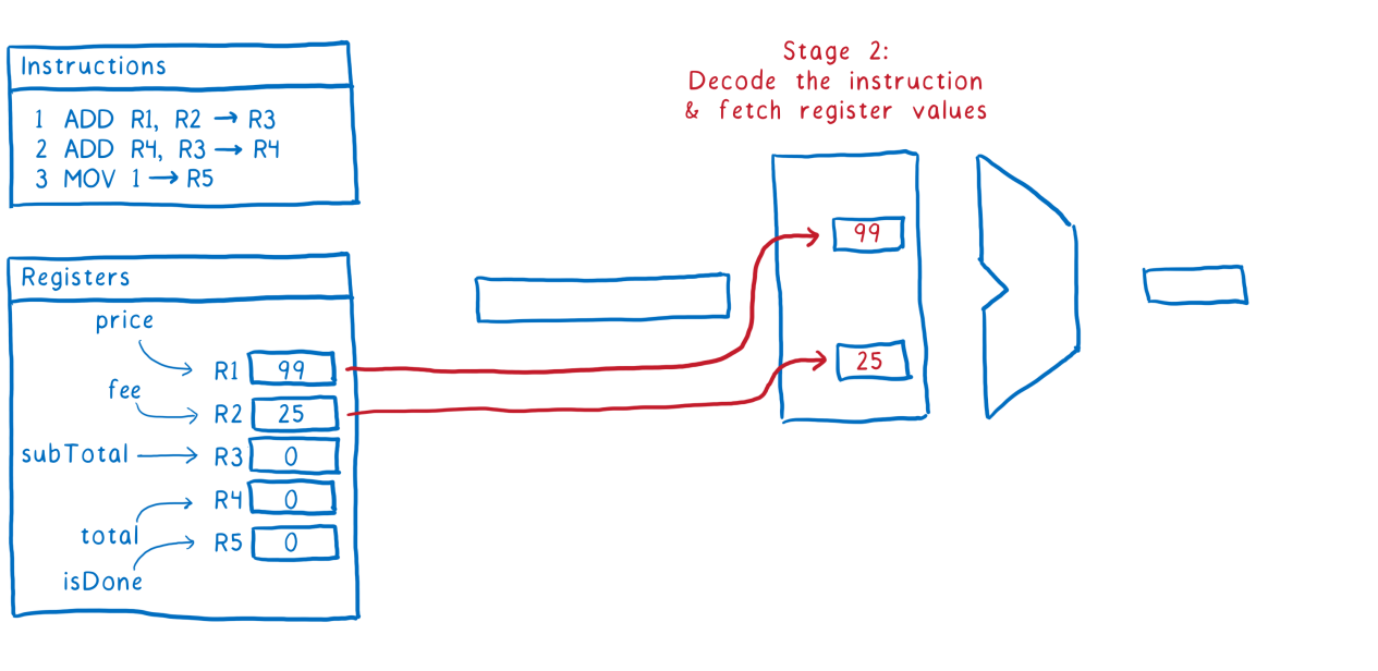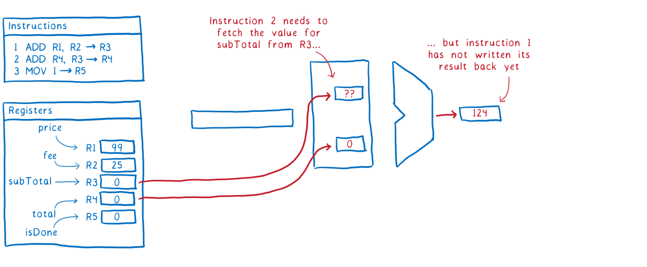 Инструкции №2 нужно получить значение переменной subTotal из R3, но инструкция №1 ещё не записала туда результат вычислений