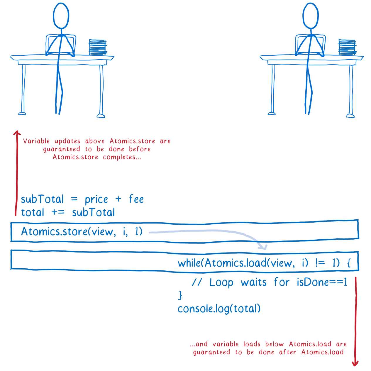 Обновление переменной выше Atomics.store гарантированно будет выполнено до завершения Atomics.store. Загрузка переменной ниже Atomics.load гарантированно будет выполнена после того, как Atomics.load завершит работу