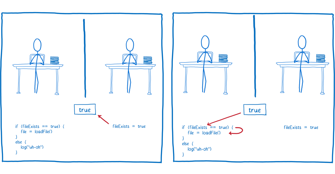 Состояние гонки потоков может возникнуть в ситуации, когда имеется переменная, доступ к которой есть у двух потоков. Предположим, первый поток, основываясь на значении переменной fileExists, загружает некий файл, а второй проверяет, существует ли файл, и, если это так, устанавливает эту переменную в значение true. В детали мы не вдаёмся, код проверки наличия файла опущен.