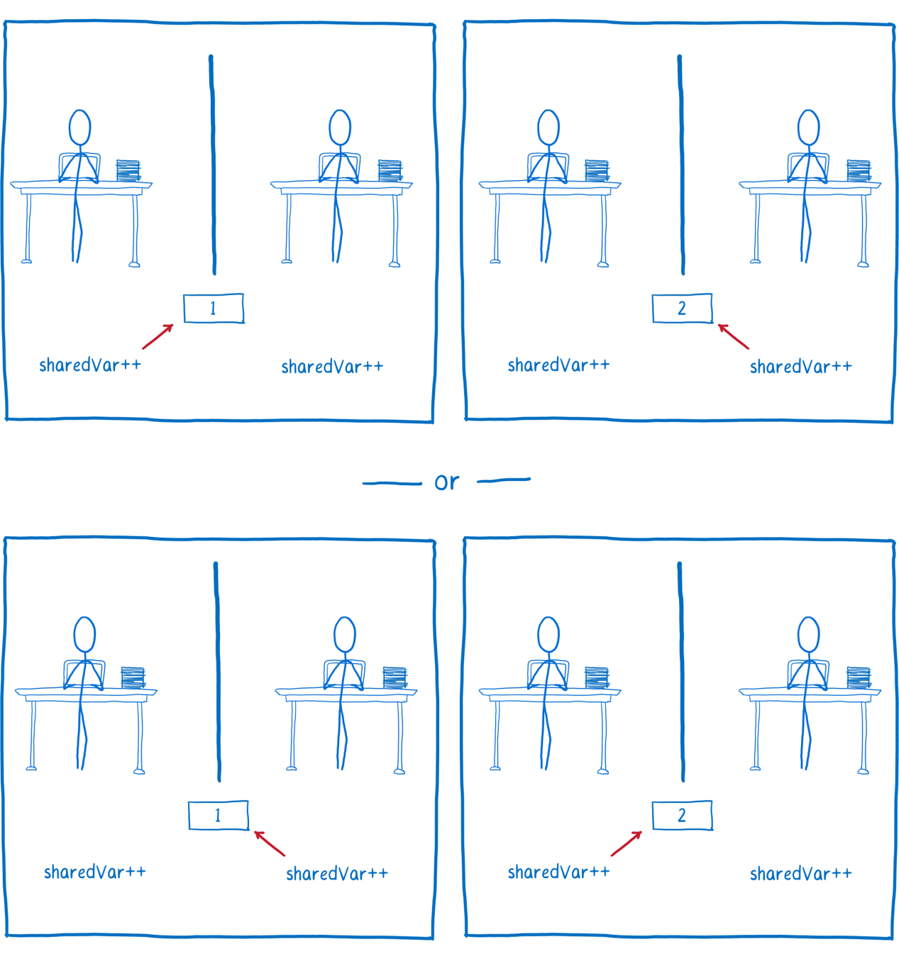Предположим, имеется два потока, которые инкрементируют одну и ту же переменную. На первый взгляд может показаться, что ничего опасного тут нет, что результат нескольких подобных операций будет одним и тем же, вне зависимости от того, какой поток выполнит увеличение переменной первым.