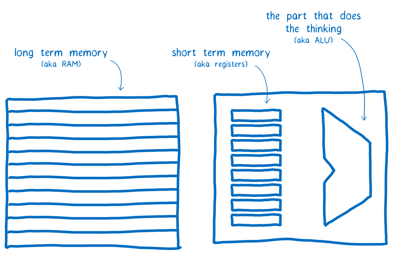 Дело тут в том, что у компьютера имеются разные виды памяти. В данном случае речь идёт об обычной оперативной памяти, которая хранит данные сравнительно длительное время, и о регистрах процессора, которые используются для кратковременного хранения данных.