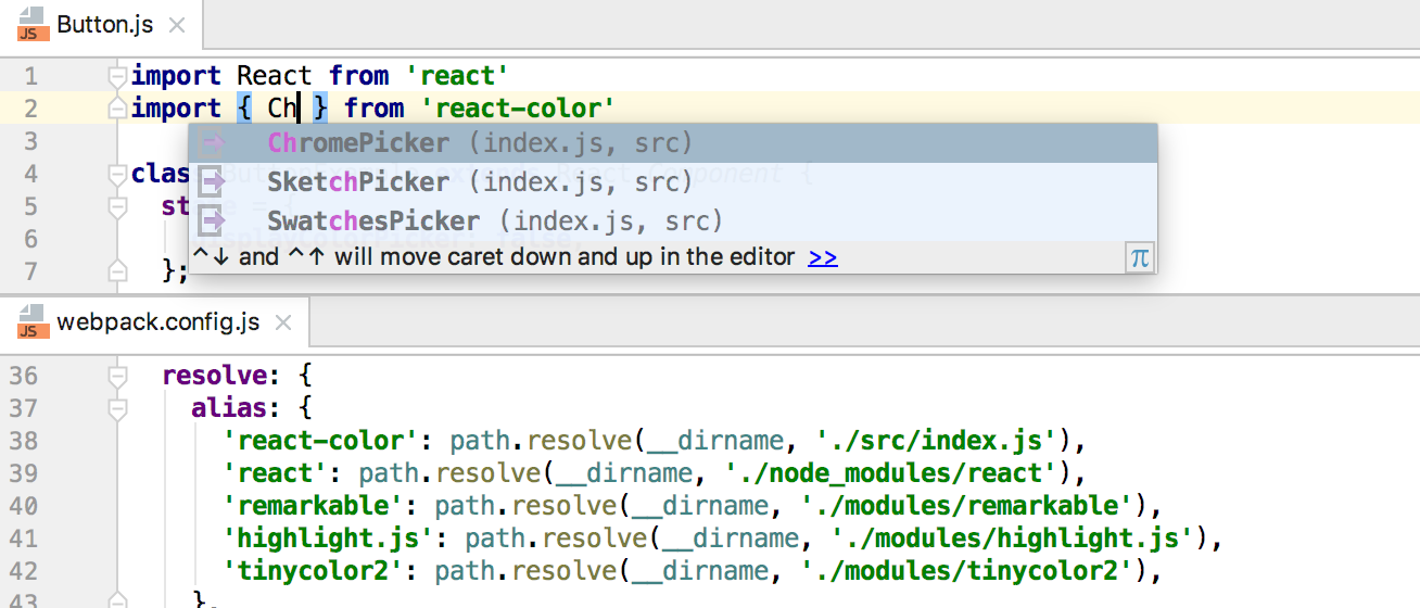 Автодополнение кода и навигация в JavaScript-файлах стали точнее в проектах, использующих webpack aliases и modules. WebStorm запускает webpack.config.js в корне проекта и использует результаты для построения более точной модели проекта. В результате WebStorm правильно поймет символы и пути в импортах.