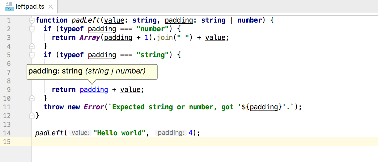 Нажмите cmd или Ctrl и наведите на символ в TypeScript-коде, и WebStorm покажет информацию о его типе с учетом текущего контекста. Это помогает быстрее находить проблемы, связанные с использованием типов.
