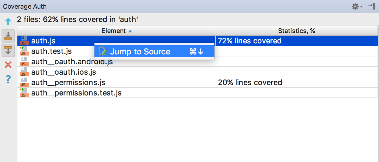 Отчет появится в отдельном окне в WebStorm и покажет сколько файлов покрыто тестами и сколько процентов строк в них покрыто тестами. Из отчета можно быстро перейти в самому файлу. Слева в редакторе строки, покрытие тестами, будут отмечены зеленым цветом, а непокрытые строки – красным.