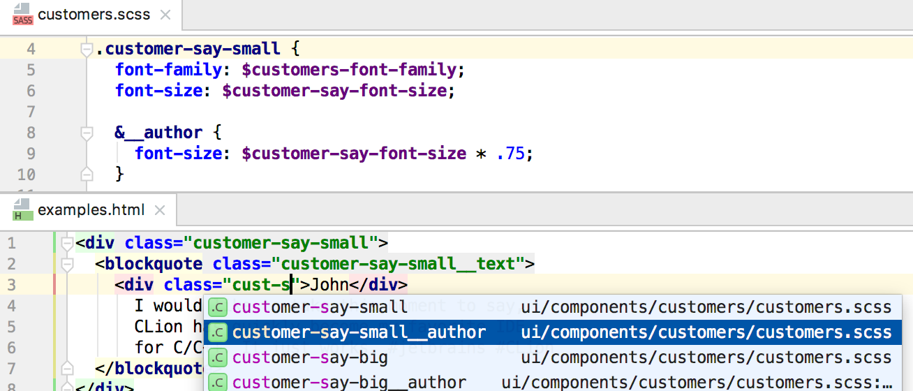 Автодополнение имен классов в HTML-файлах теперь работает для Sass- и SCSS-селекторов, созданных через &.