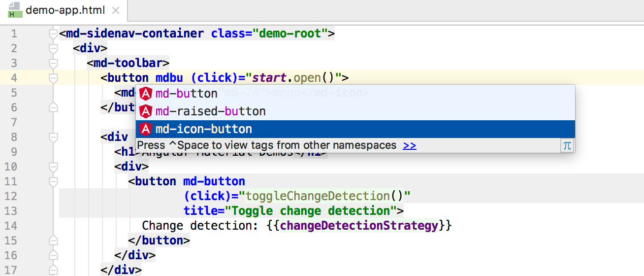 Angular Material – это библиотека UI-компонентов для Angular. Теперь WebStorm лучше понимает и подсказывает специальные атрибуты из Angular Material в Angular-шаблонах.