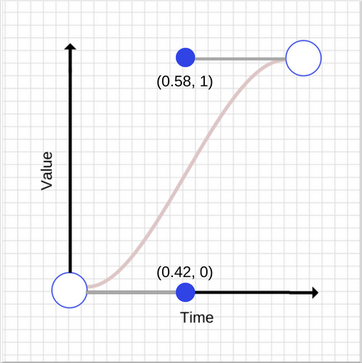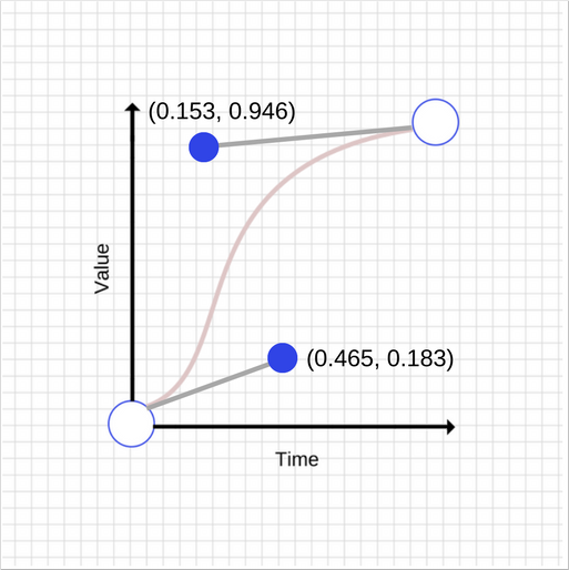 Для построения кривой Безье нужно четыре значения, или, говоря точнее — две пары чисел. Каждая пара описывает координаты X и Y опорной точки кубической кривой Безье. Сама кривая начинается в координате (0, 0), а заканчивается — в координате (1, 1). Настраивать можно свойства опорных точек. Значения X координат опорных точек должны находиться в диапазоне [0 ,1], значения Y также должны попадать в диапазон [0, 1], хотя надо отметить то, что спецификации не вполне проясняют этот момент.