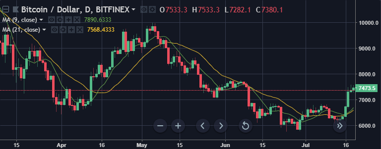 Скользящая средняя является запаздывающим индикатором и помогает определить тренд. Она рисуется наложением поверх графика цен и первые значения обычно обычно отбрасываются. Обычно рассматривают пару идникаторов и точка, когда идикатор с коротким окном пересекает идикатор с длинным окном снизу рассматривается как потенциальная точка входа, и сверху — выхода. На практике чаще используют экспоненциально взвешенную скользящую среднюю, применяя весовую оконную функцию, что бы уменьшить эффект запаздывания.