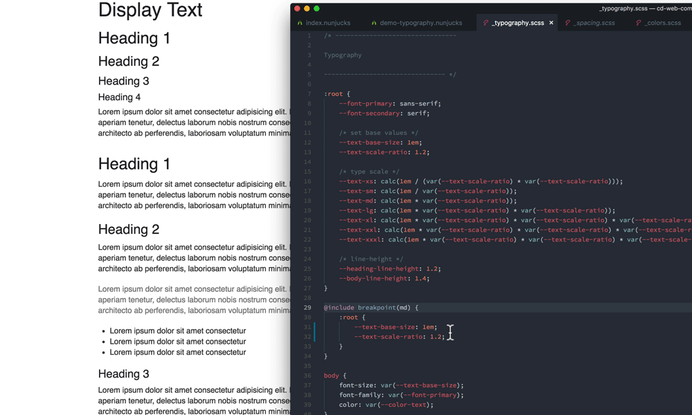 При создании фреймворка мы решили включить всю формулу масштаба в файл _typography.scss. Вот как мы устанавливаем масштаб типа с помощью переменных CSS: