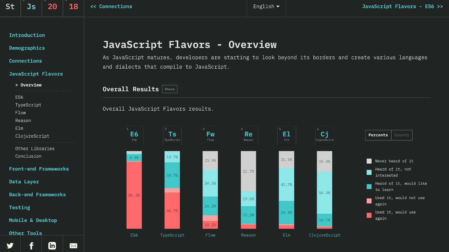 В ежегодном опросе «The state of JavaScript» разработчики рассказывают о том, что они используют здесь и сейчас. Вопросы там знакомы и привычны фронтенд-сообществу. В 2019 году появился опрос «The state of CSS», который ввёл разработчиков в ступор. Оказывается, многие технологии разработчикам не знакомы, хотя большинство из них уже активно используются. Возможно, разработчики используют привычные инструменты и технологии, и не стремятся применять что-то новое? Возможно, просто нет задач под новые технологии? Зачем использовать CSS Grid, CSS Multi columns, там, где проще построить все на Flexbox? Возможно, это все касается старичков, а джуны уже и не знают про Flexbox и Float и в опросах не участвуют?
