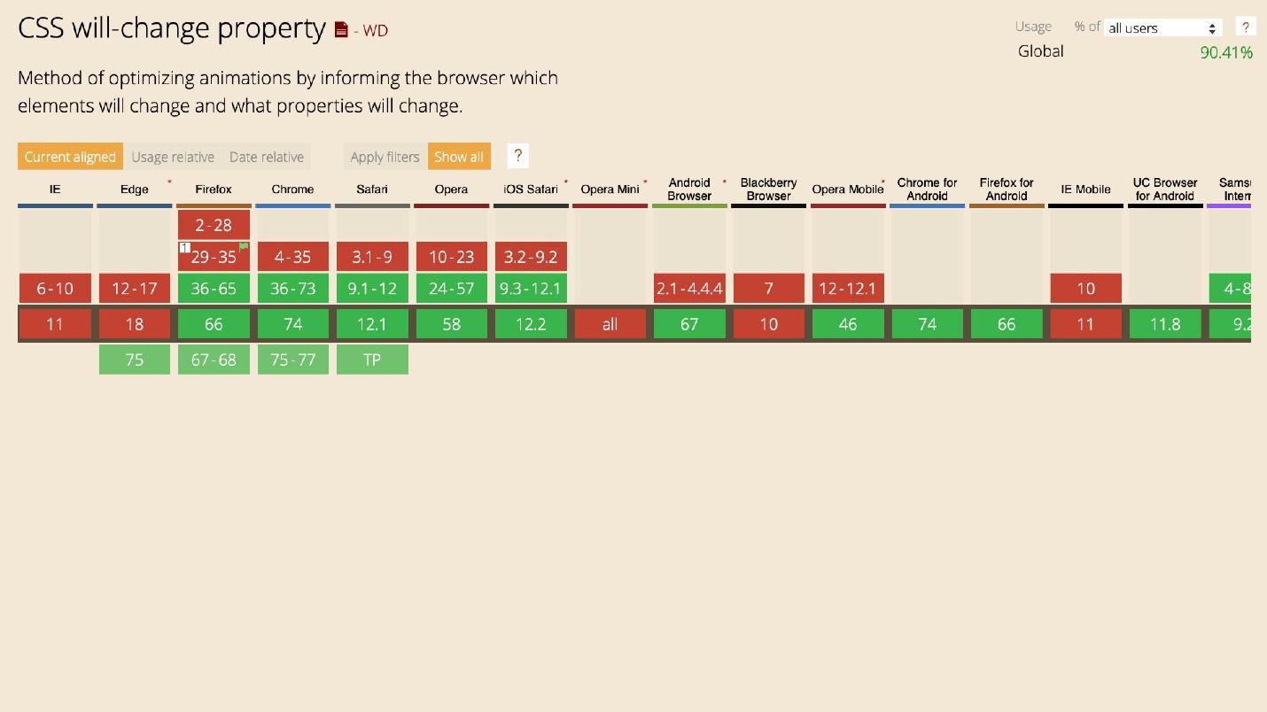 IE, Blackberry, Opera Mini не поддерживают CSS Will Change, но для всего остального его можно использовать уже сейчас.