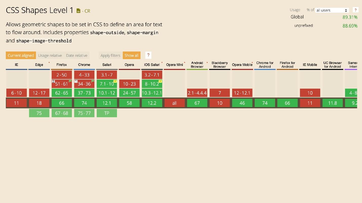 Чем меньше кейсов, тем меньше процент использования: мультиколонки для текста, режимы написания для сложных мест, где в интерфейсе сделать проще, чем с помощью transform. Разумеется, нет режима начертания текста по диагонали.