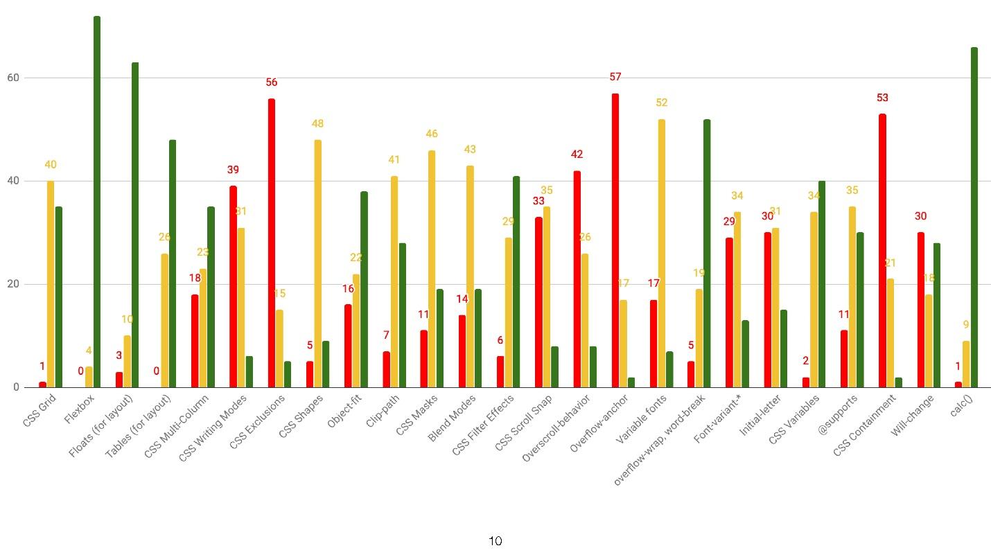 Это распределение по фичам: зелёные — использую, красные — не знакомы, желтые — знакомы, но не использую. 23 мая я написал запрос команде, которая запустила оригинальный «The state of CSS», и попросил результаты. К счастью, они мне ответили и прислали, что я хотел.