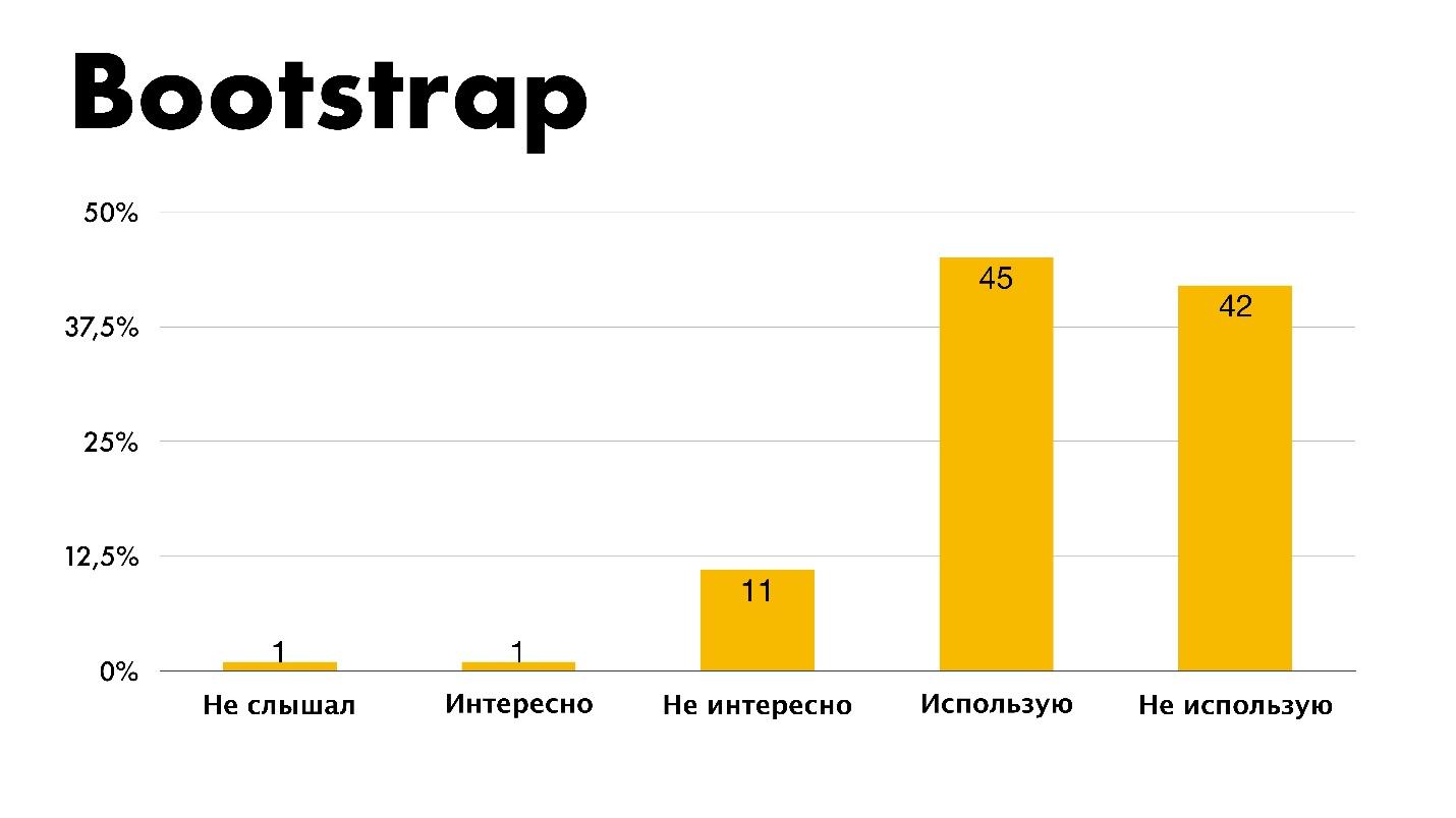 Bootstrap. Странное распределение — лагерь разделился поровну на тех, кто использует и тех, кто нет. Забавно, что одному проценту Bootstrap интересен, но он его не использует. Еще есть 11 процентов, кому это интересно. Лично я Bootstrap не жалую.