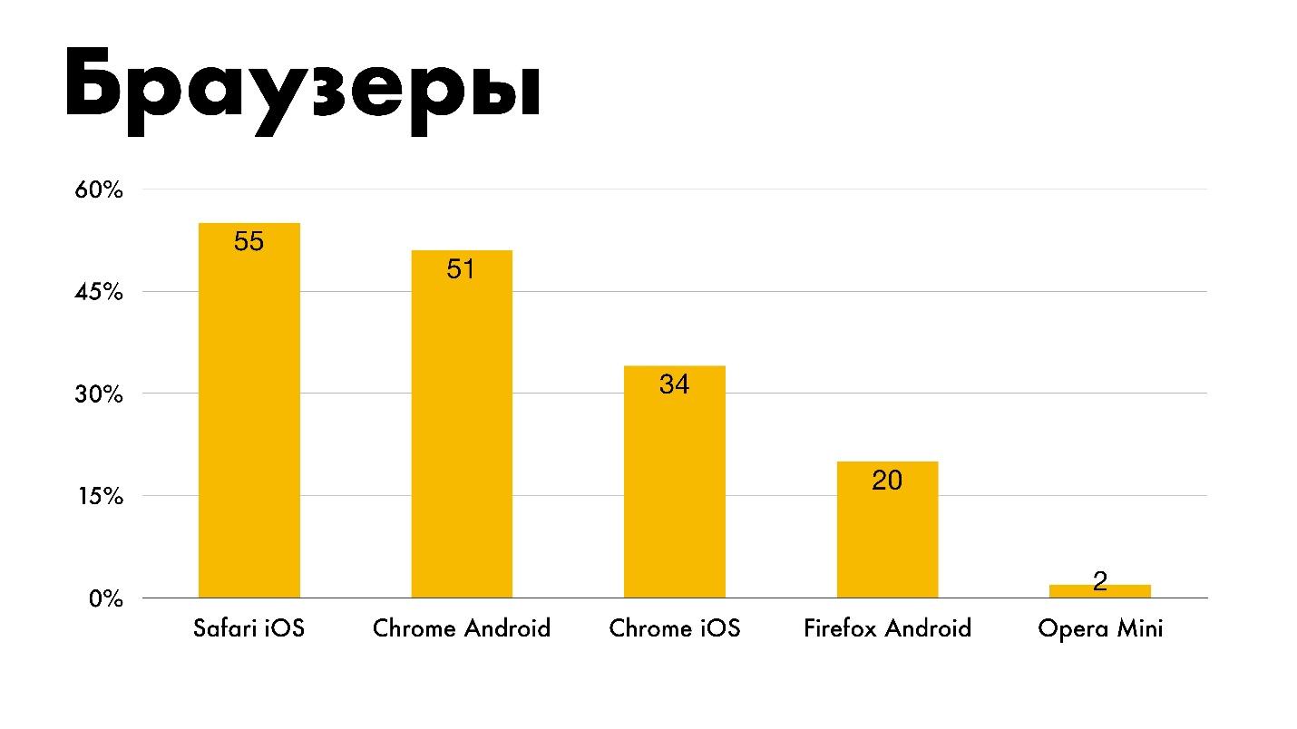 Мобильные браузеры используют для разработки Safari iOS, Chrome Android, Chrome iOS, Firefox Android. Два процента людей до сих пор поддерживают Opera Mini, которая ничего не поддерживает.