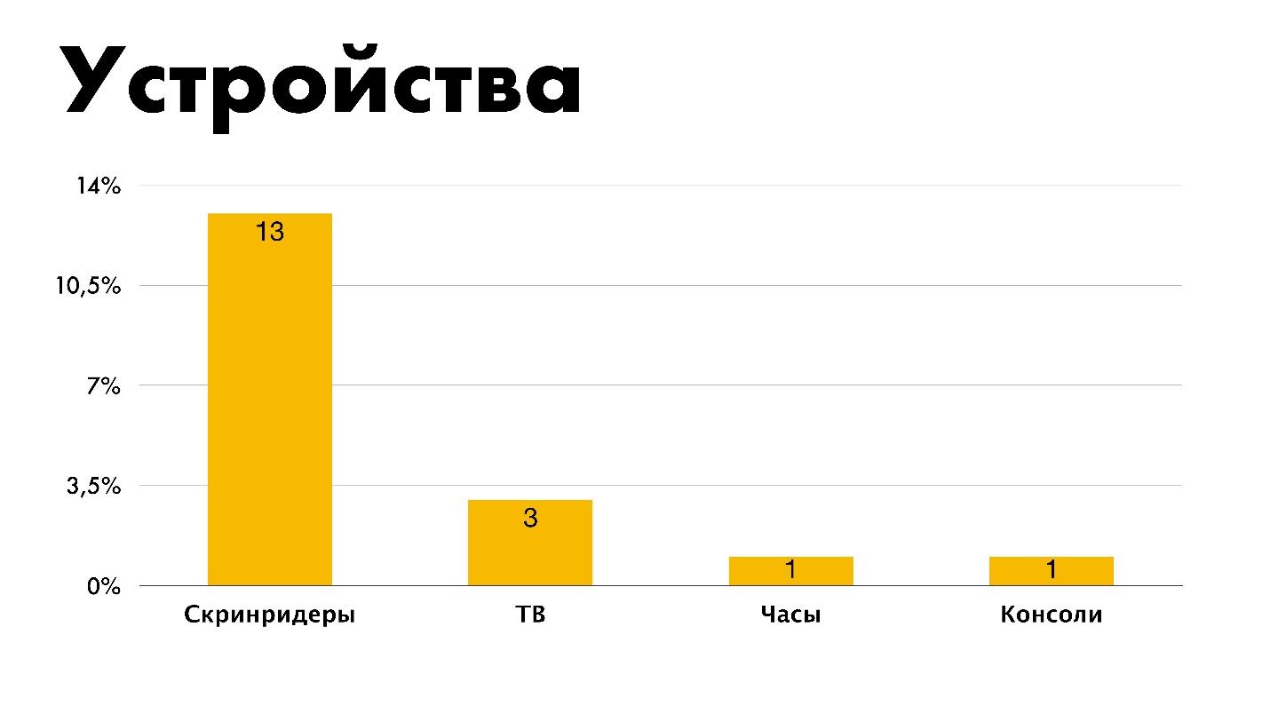 Всего 13% людей тестируют верстку в скринридерах, Это плохо. Три верстают под ТВ и по одному — под часы и консоль. Видимо, это один и тот же человек. Я поставил не проценты, а число людей для контраста, хотя с точки зрения графика это неверно.