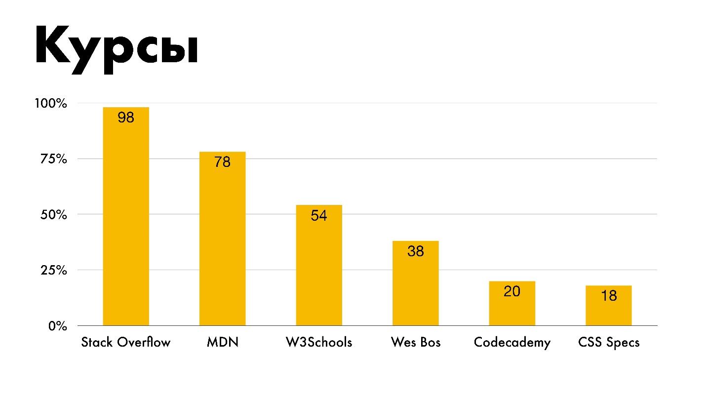 Я специально выделил, что 18 человек в качестве курсов используют CSS-спецификации. Старая школа.