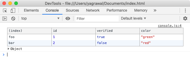 Мы можем сделать следующий шаг, поместив все это в таблицу, чтобы сделать ее более читаемой. Всякий раз, когда у вас есть объекты с общими свойствами или массив объектов, используйте console.table (). Здесь мы можем использовать console.table ({foo, bar}) и консоль показывает:
