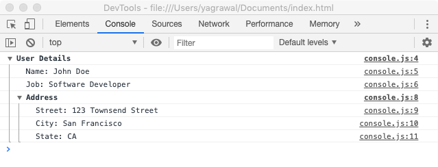 Вы также можете использовать console.groupCollapsed () вместо console.group (), если вы хотите, чтобы группы были свернуты по умолчанию. Вам нужно будет нажать кнопку дескриптора слева, чтобы развернуть.