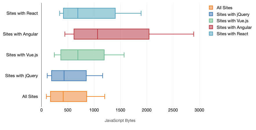 Я решил сравнить агрегированные HTTP Archive данные по всем сайтам с данными по сайтам, на которых обнаружено использование React, Vue и Angular, хотя я рассматривал возможность использования и другого исходного материала.