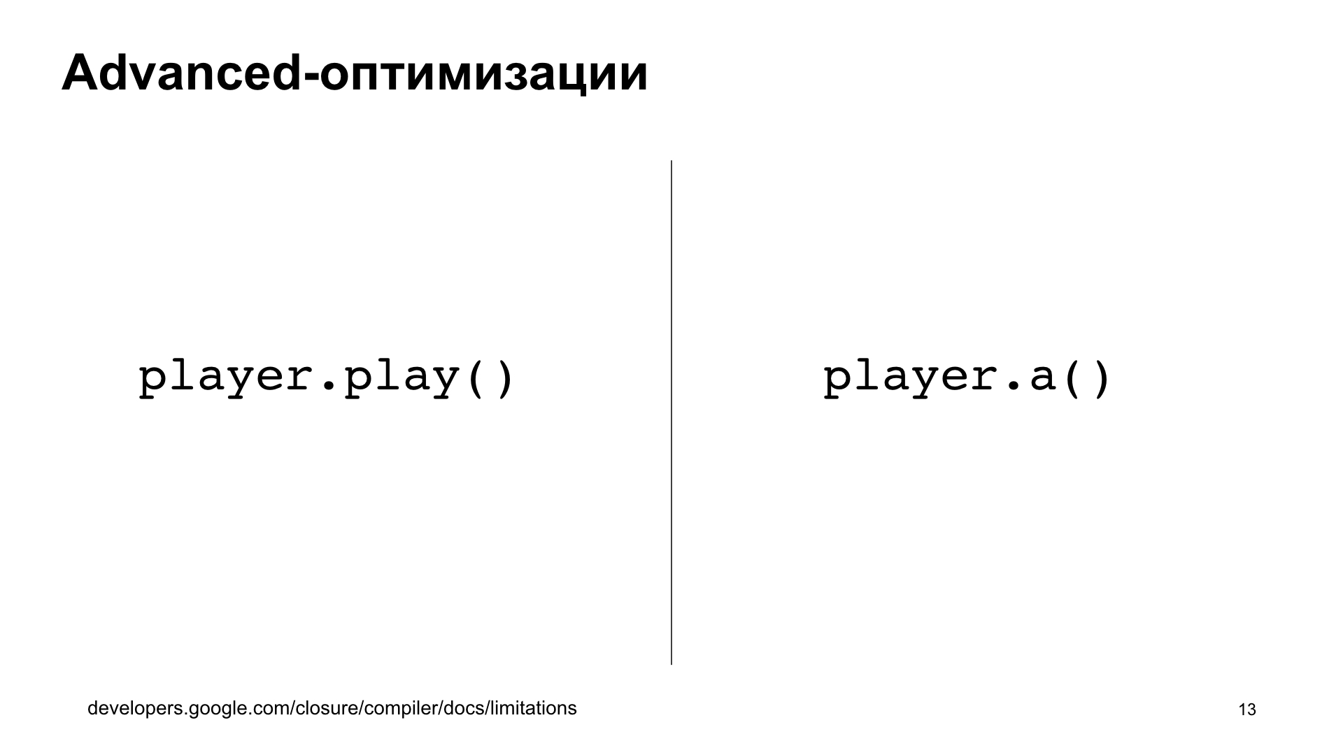 Для нашего проекта это еще критичнее. Как я говорил, мы разрабатываем видеоплеер. Видеоплеер — это встраиваемая библиотека. Если Closure Compiler переименует поле в нашей встраиваемой библиотеке, переименует публичный метод, то внешний код сломается и не сможет взаимодействовать с плеером.