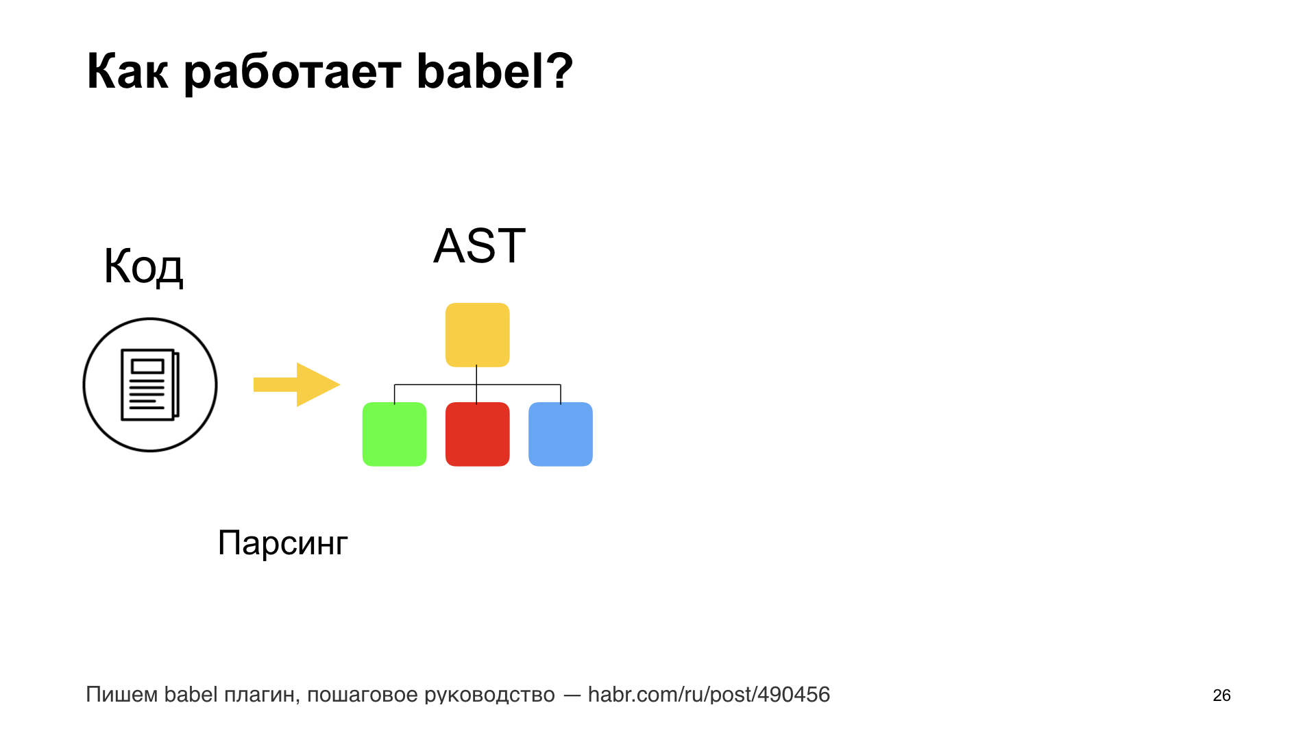 Итак, Babel, как и любой транспойлер кода, сначала парсит его и строит абстрактное синтаксическое дерево, abstract syntax tree, AST. Это некоторое дерево, которое описывает код.