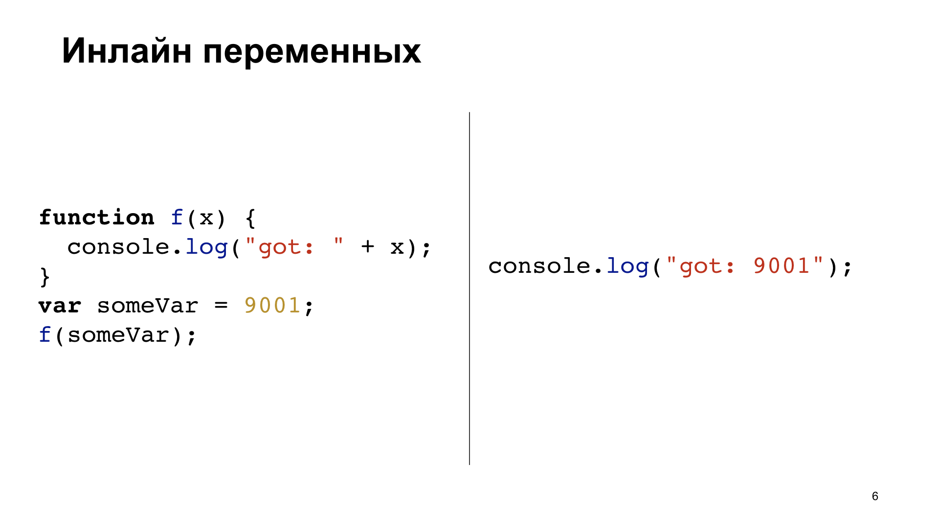 Следующий пример. Здесь мы объявляем метод у объекта, который внутри использует ключевое слово this. После сборки с помощью Closure Compiler и удаления мертвого кода, как видно на слайде, идентификатор this станет глобальным. Вы опять же получите ошибку в коде.