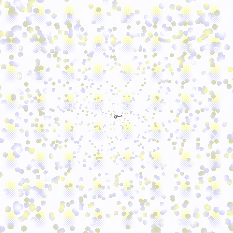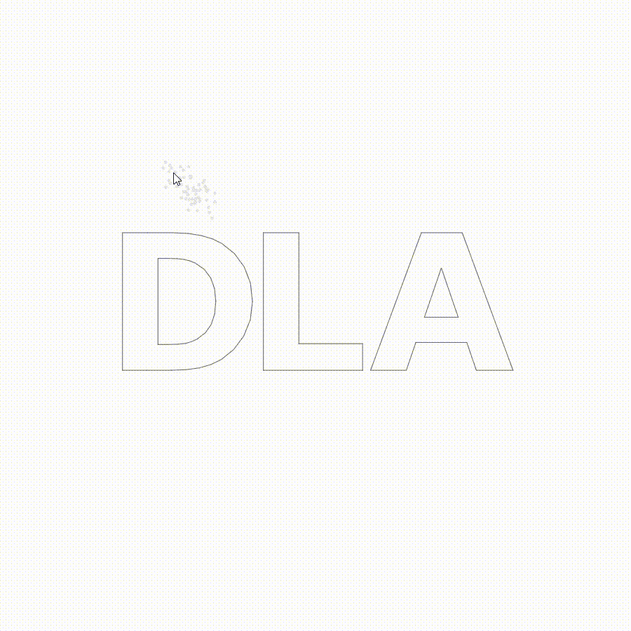 DLA.js— управляет самой симуляцией и выполняет её. Вызывает функциюiterate()для шага вперёд на один цикл и функциюdraw()для отрисовки всех частиц на экране. Также раскрыта целая куча других функций, что позволяет создавать всевозможные интересные конфигурации!Defaults.js— объект, содержащий в себе параметры конфигурации, которые могут переопределяться отдельными эскизами.