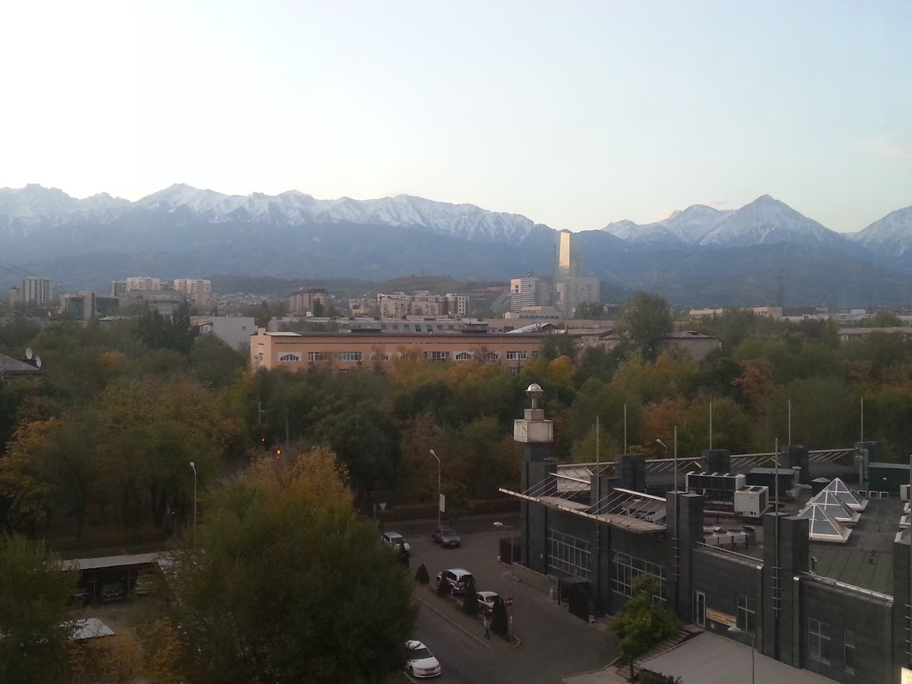 Еще Алматы довольно зеленый город - в нём много деревьев, которые спасают от жары и дают тень. Но вид гор с шапками снега, когда внизу девушки ходят в блузках, а парни в рубашках, и на деревьях все еще (или уже) есть листва - это незабываемо. Что-то подобное можно испытать в Сочи, но там как-то иначе. Надо куда-то ехать, куда-то забираться, куда-то подыматься. А здесь не так.