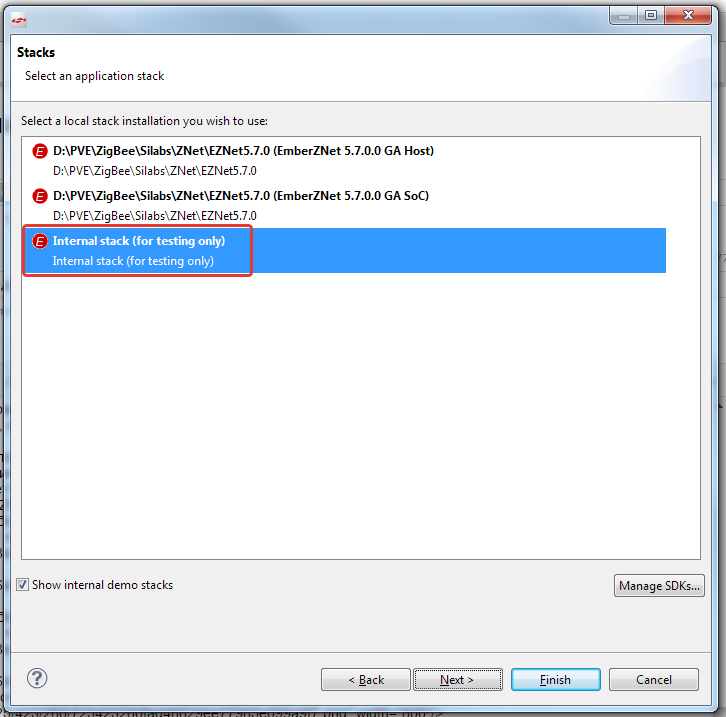 Далее выбираем фреймворк. Для ZigBee-приложений это будет ZCL Application Framework v2. Важно: необходимо установить галочку для отображения демонстрационных встроенных стеков.