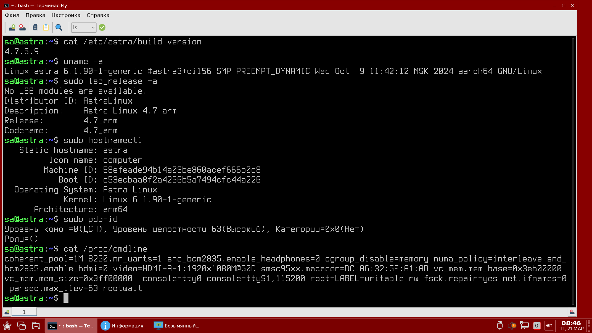 Мы добавили параметр чтобы ядро грузилось с уровнем целостности 63, что в дальнейшем позволит нам включить мандатный контроль целостности на файловой системе.