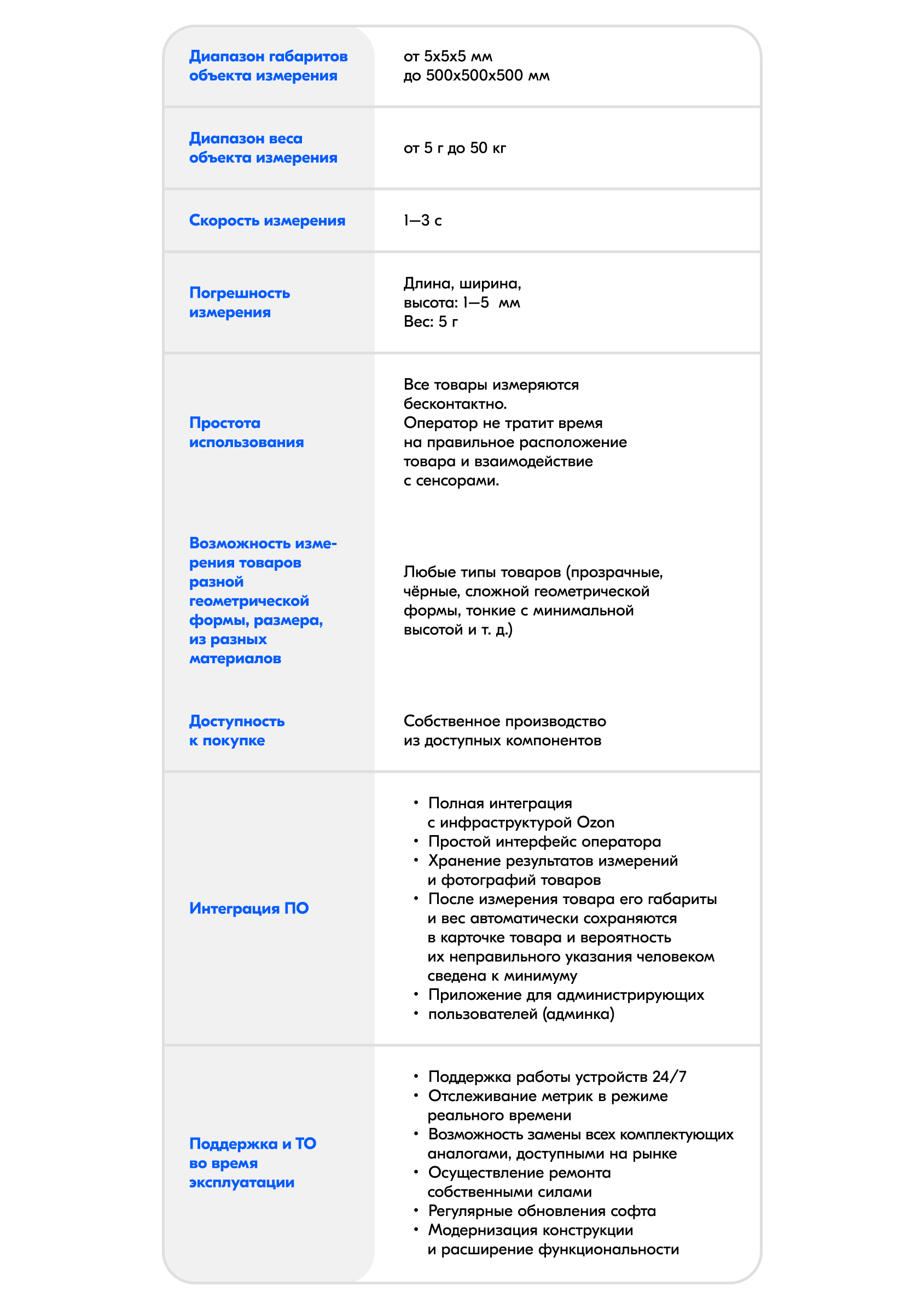На складах Ozon хранятся абсолютно разные товары — по форме, плотности, материалу и цвету упаковки. Необходимо иметь возможность измерять любой товар с максимальной точностью. Это один из важнейших критериев выбора измерителя.