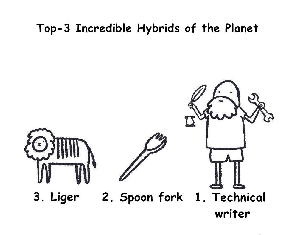 Спасением стало неясное словосочетание «технический писатель», появившееся сначала в лексиконе моей мамы, а потом и преподавателей курсе так на 4. Хотя что это за зверь, и с чем его едят, было мало понятно. Вроде гуманитарная работа, а и в технике надо разбираться, и, возможно, даже уметь писать код (ну или хотя бы читать его). Но это не точно.