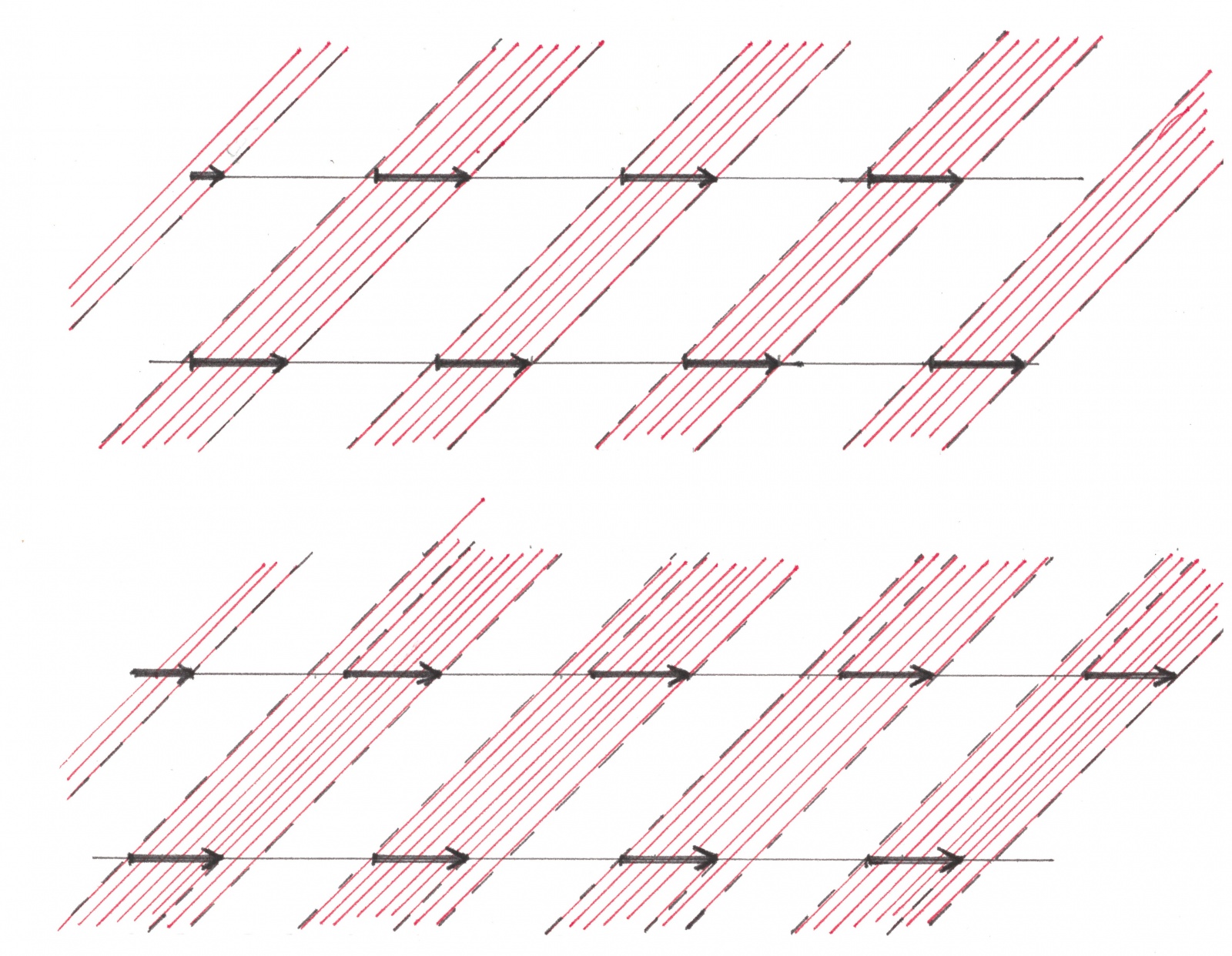 Из требования T-периодичности вытекает, что каждый ее поток оказывается составленным из чередующихся белых и черных зон одинаковой величины, равной T/2. В рассматриваемой схеме движения, как и в любой другой, обязательно присутствует хотя бы один горизонтальный поток, движущийся вправо. Связанный с этим потоком линейчатый узор из красных теневых полос должен выглядеть как на рисунке 16a.