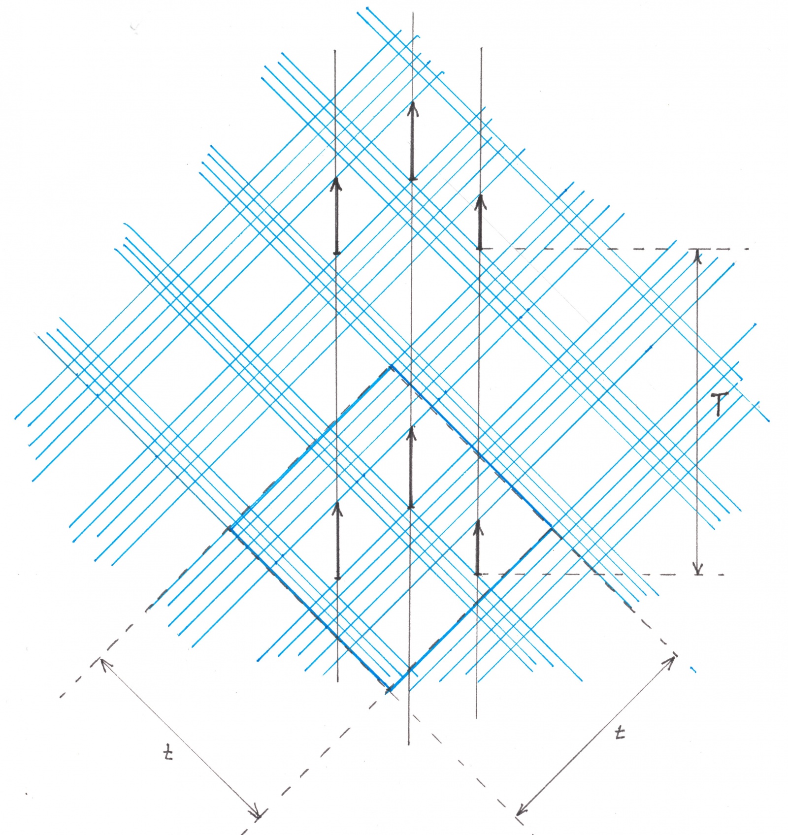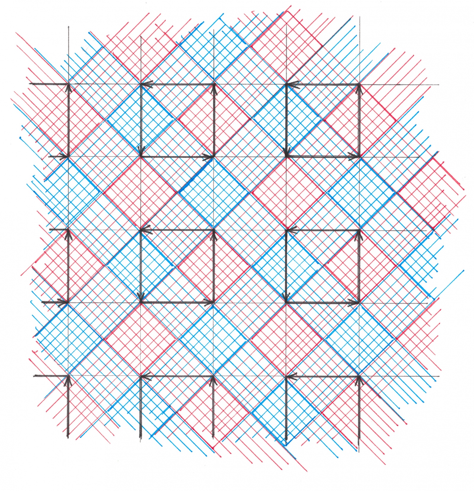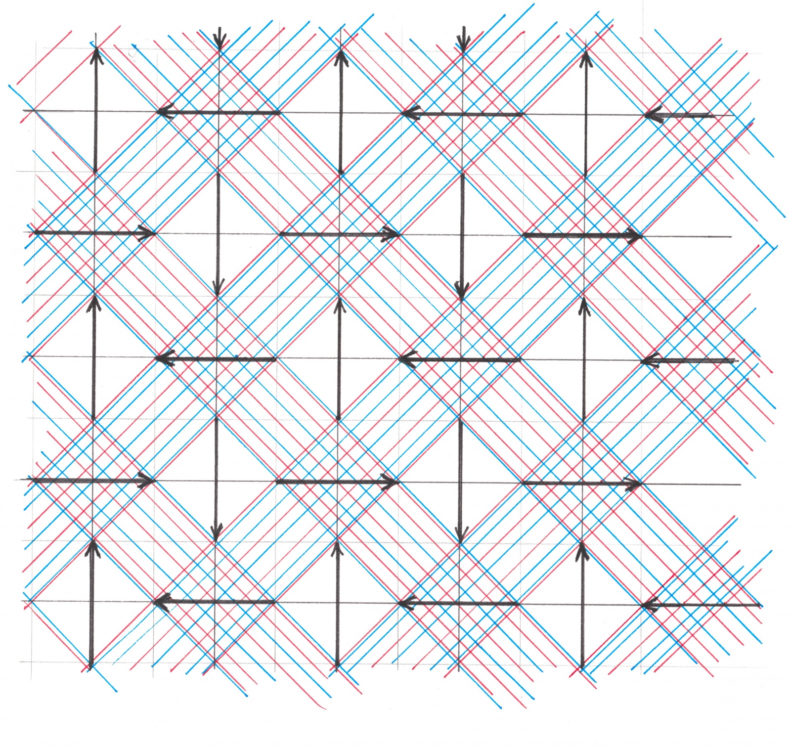 Возьмем два произвольно расположенных друг относительно друга клетчатых узора с диагональным расположением полос, первый из которых — красно-красный, а второй — сине-синий. Пусть цветовые клетки обоих узоров являются равновеликими квадратами с длиной диагонали равной T/2. Нанесем на плоскость любую сеть из горизонтальных и вертикальных потоков, лишь бы их положения удовлетворяли следующим требованиям:
