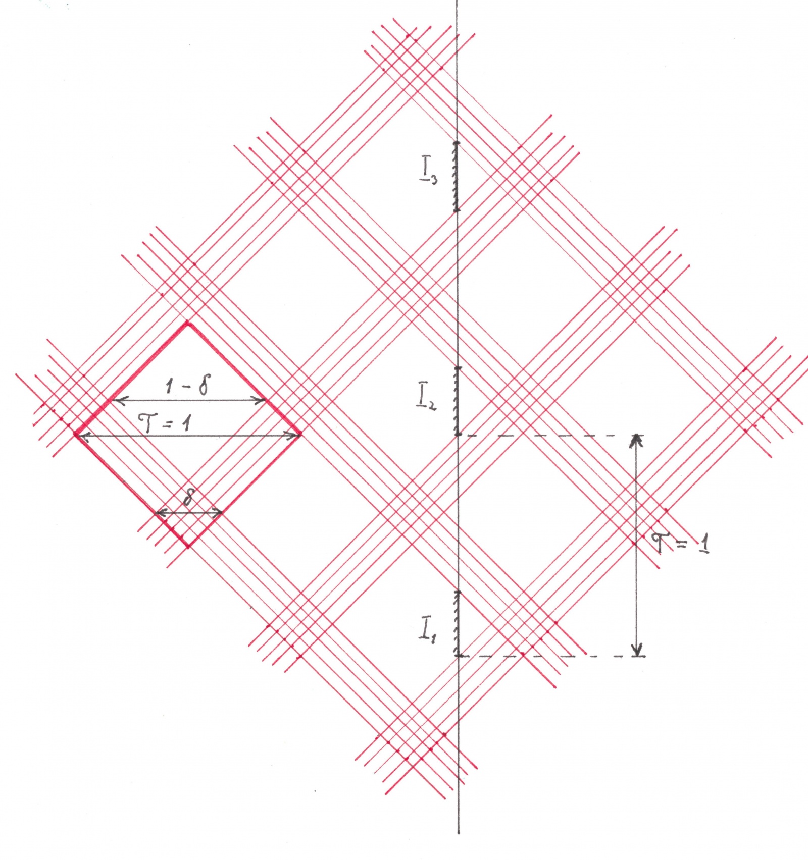 Доказательство достаточно провести только для таких размещений, каждое из которых использует все дороги с равной эффективностью (утверждение 1 предыдущего параграфа). Произвольно выберем одно из таких размещений и обозначим его эффективность как δ (период T =1). Каждый поток этого размещения составлен из чередующихся друг с другом черных зон длины δ и белых зон длины 1 — δ. Построим красные теневые полосы для каких-нибудь двух встречных потоков выбранного размещения. Пересекаясь, эти полосы образуют клетчатый узор, фрагмент которого вы можете видеть на рисунке 18.
