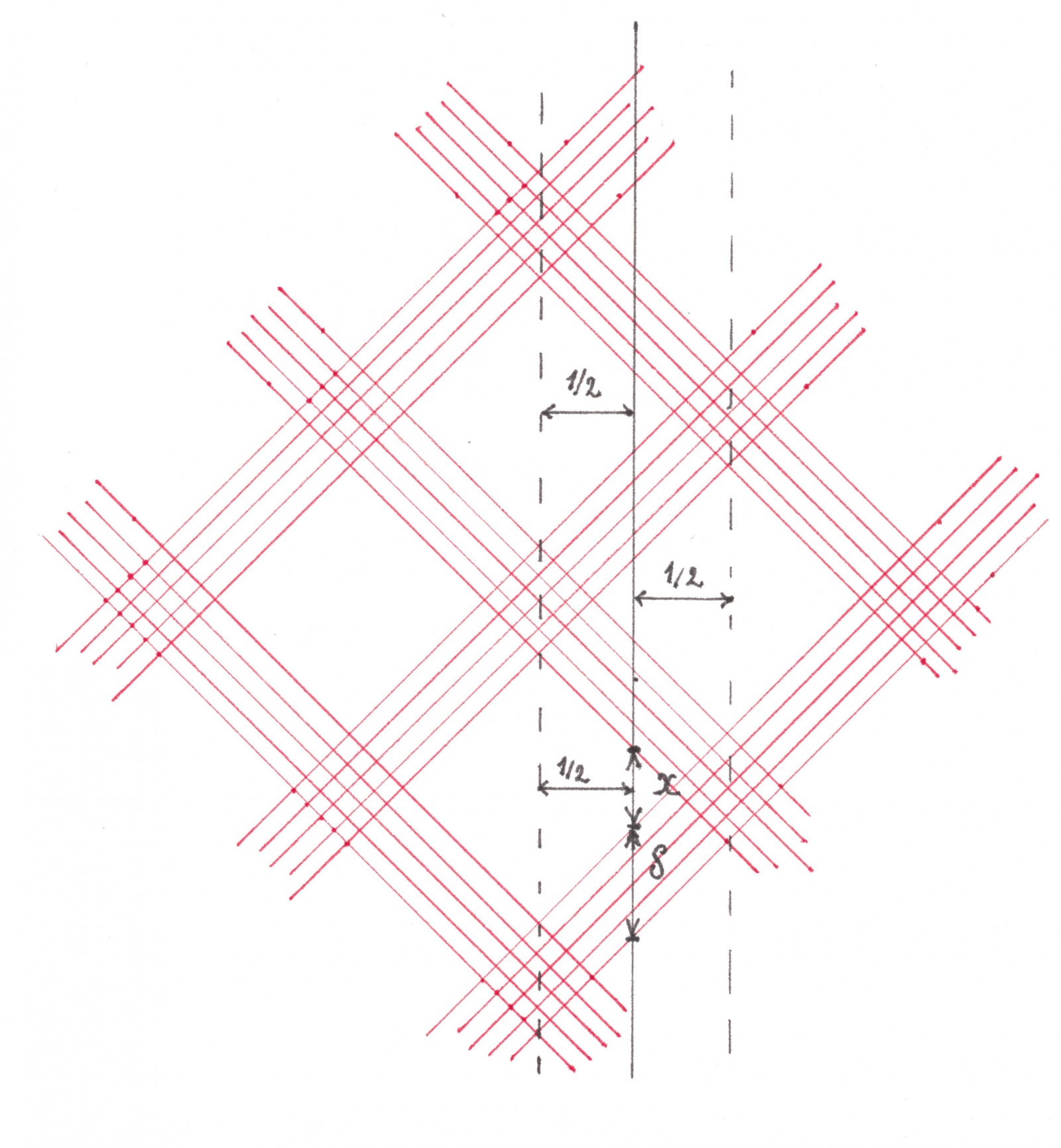 Элементарная ячейка этого узора будет иметь форму квадрата с диагональю единичной длины, а его красные полосы — пересекать любую горизонтальную или вертикальную прямую по отрезку величиной δ.