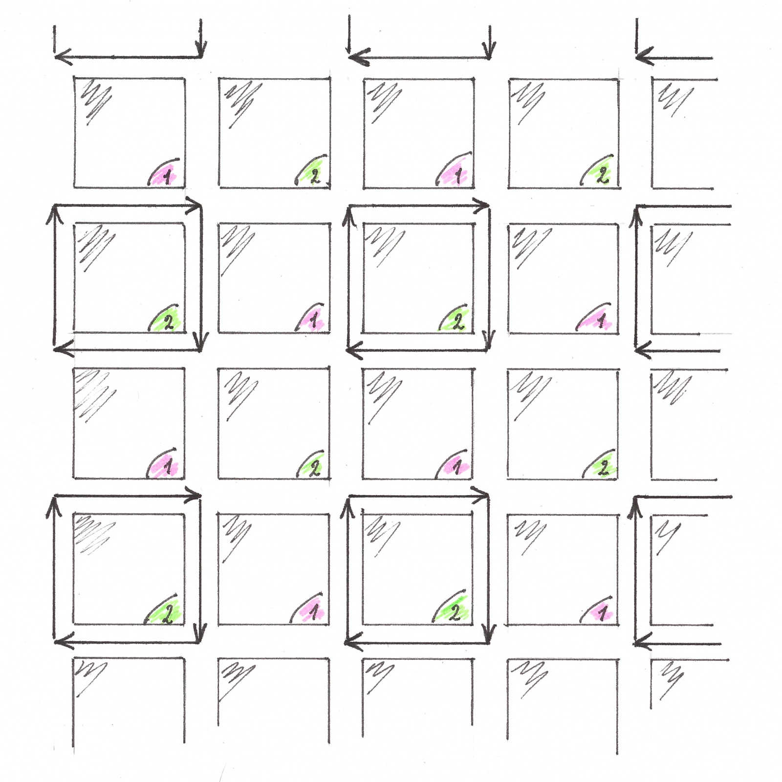 Давайте в размещениях, представленных на рисунках 4 и 5, у каждого потока вычеркнем каждую вторую по порядку следования «стрелку» (можно было бы вычеркнуть каждые две из трех, или n — 1 из n). Обновленные потоки по-прежнему не будут вступать в конфликт, а длина их пространственного периода удвоиться. Теперь сожмем весь макет в два раза, как вдоль вертикали, так и вдоль горизонтали. В результате сжатия пространственные периоды зеленых вернут свою первоначальную величину, а протяженность каждого квартала уменьшится в два раза.