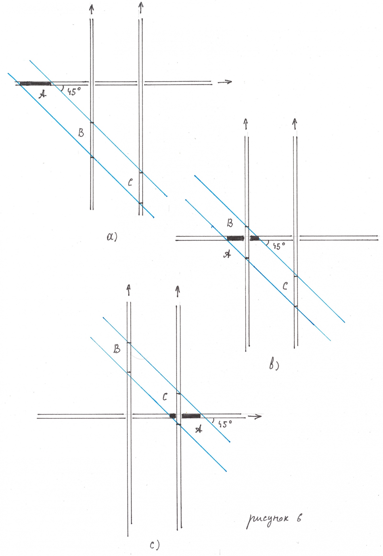 На рисунке 6 в три различных момента времени изображены два вертикальных и один, пересекающий их, горизонтальный поток. Как уже было сказано, скорости всех потоков предполагаются одинаковыми, а движение — не приводящим к конфликтам между их черными зонами. Фрагмент A горизонтального потока, будучи черным, запрещает тем самым оказаться черными фрагментам B и C вертикальных потоков.