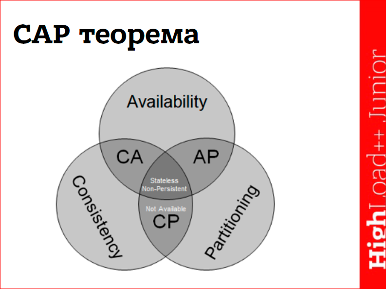Теорема была сформулирована в году 2001-м, и некоторые считают, что она утратила актуальность и вообще не стоит про нее говорить, но упомянуть стоит. Она звучит так: распределенная система не может одновременно обладать более чем двумя из следующих трех характеристик — это доступность (availability), согласованность (consistency) и устойчивость к разрывам сети (partition tolerance).