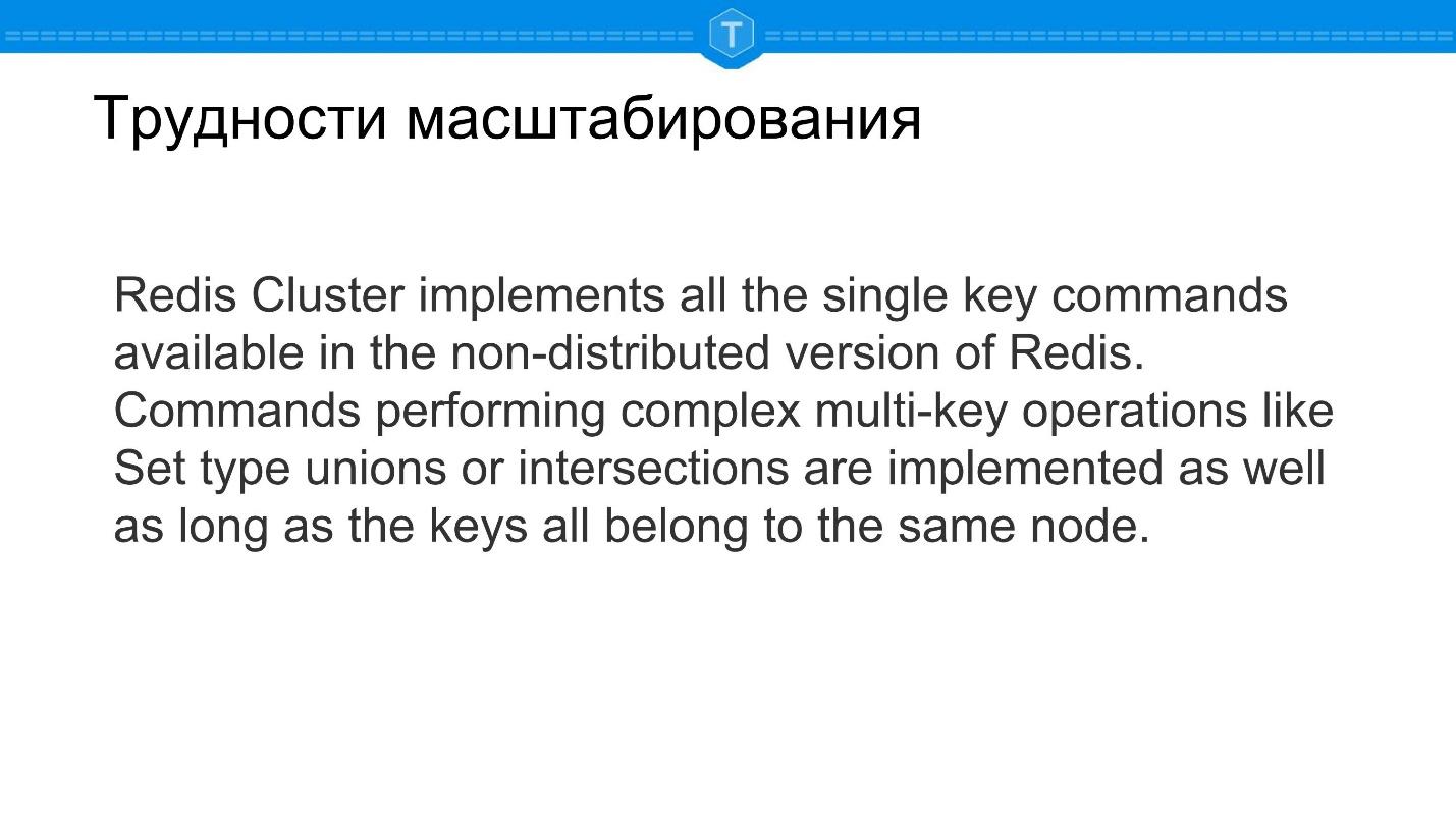 Когда Redis добавил Redis кластер, выяснилось, что не все операции моделей данных нормально горизонтально масштабируются.
