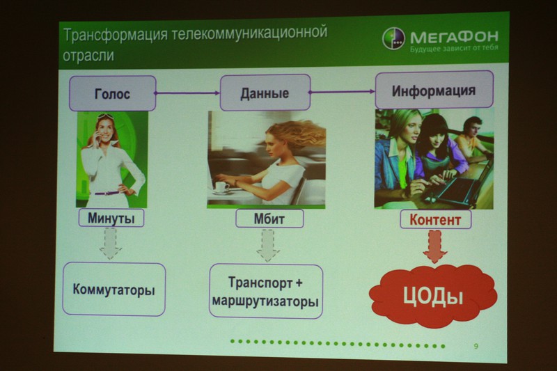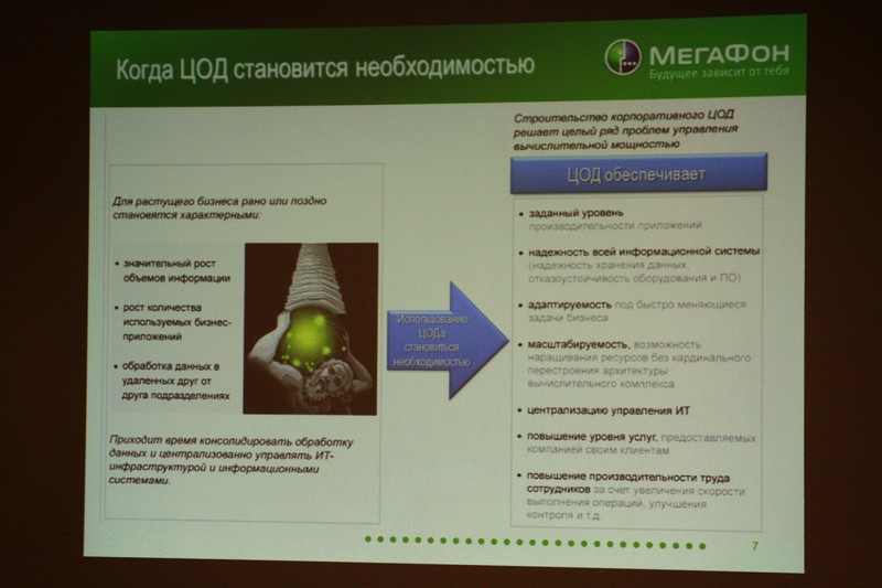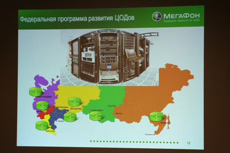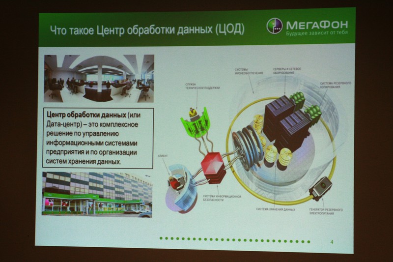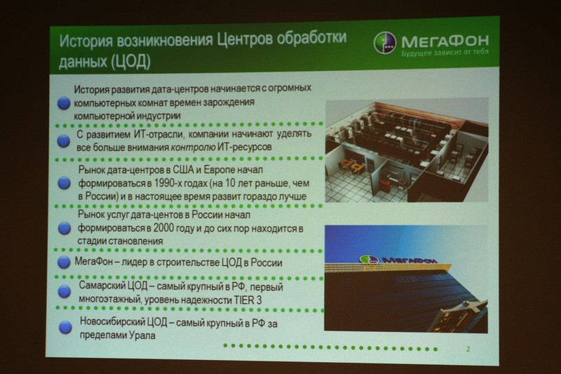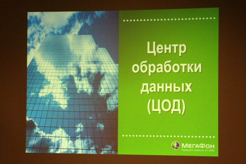 Сначала была показана презентация, из которой, кроме сухой статистики по ЦОД, мы узнали, что услугами ЦОДа пользуются RuTube, Siemens, ВТБ24 и другие крупные компании (как было сказано, от 5 компьютеров :) ), что сервера арендуются под облачные вычисления, и что компания Мегафон находится на стадии трансформирования из оператора базовых услуг в оператора комплексных услуг. Так же было сказано, что скоро Мегафон выйдет на рынок хостинг-провайдеров для масс.