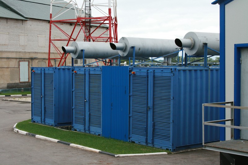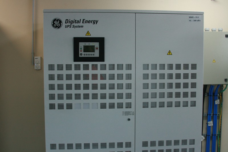 Техник рассказал нам, что сейчас ЦОД потребляет 1,5 МВт, но канал зарезервирован до 2 МВт, т.е. есть куда расти. ЦОД подключен к 2м электромагистралям (если выходит из строя одна, то автоматически подключается вторая). Но если вдруг они обе выходят из строя, тогда в работу включаются дизельные генераторы — 4 штуки по 700 КВт (фотографии будут ниже, на улице), т.е. даже при полном потреблении в 2 МВт работу ЦОД будут обеспечивать 3 генератора, а 4й будет запасным на случай выхода из строя или ремонта одного из генераторов. И всю эту электрическую вакханалию завершают аккумуляторные батареи, которые сглаживают переходы между источниками питания и в самой критической ситуации могут поддержать работу системы без питания (эдакий огромный ИБП).