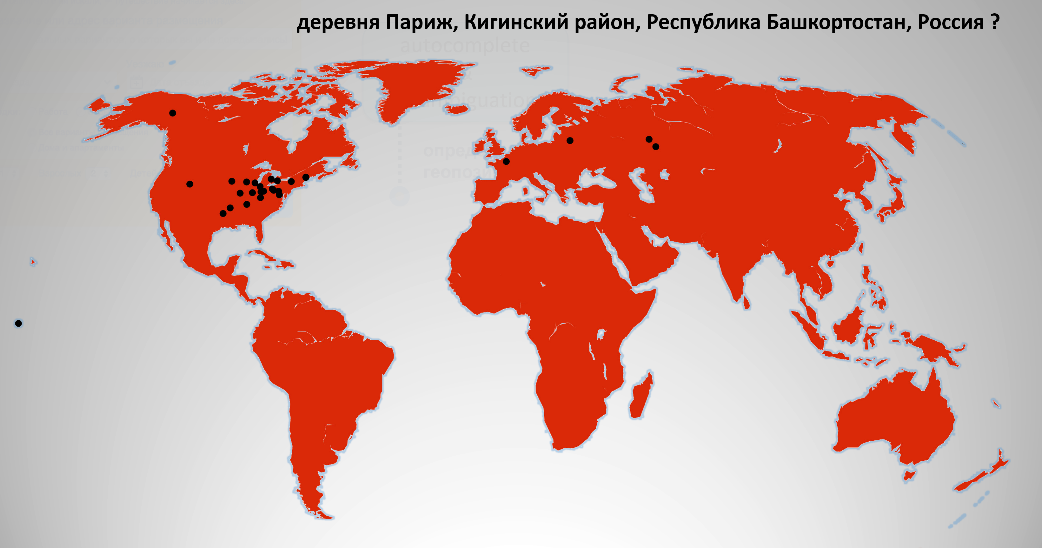 Дело в том, что если просто поискать по слову «Париж», то получится, что Парижей во всём мире порядка 30 штук. Например, деревня Париж, Кигинский район, Республика Башкортостан, Россия. Вряд ли это то, что он имел в виду. Есть еще деревня в Белоруссии, даже две, один остров Тихом океане, штук 10-15 есть в США.