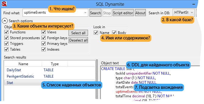 - Поиск вхождений в имени или тексте хранимых процедур, функций, триггеров, таблиц и индексов, ключей;