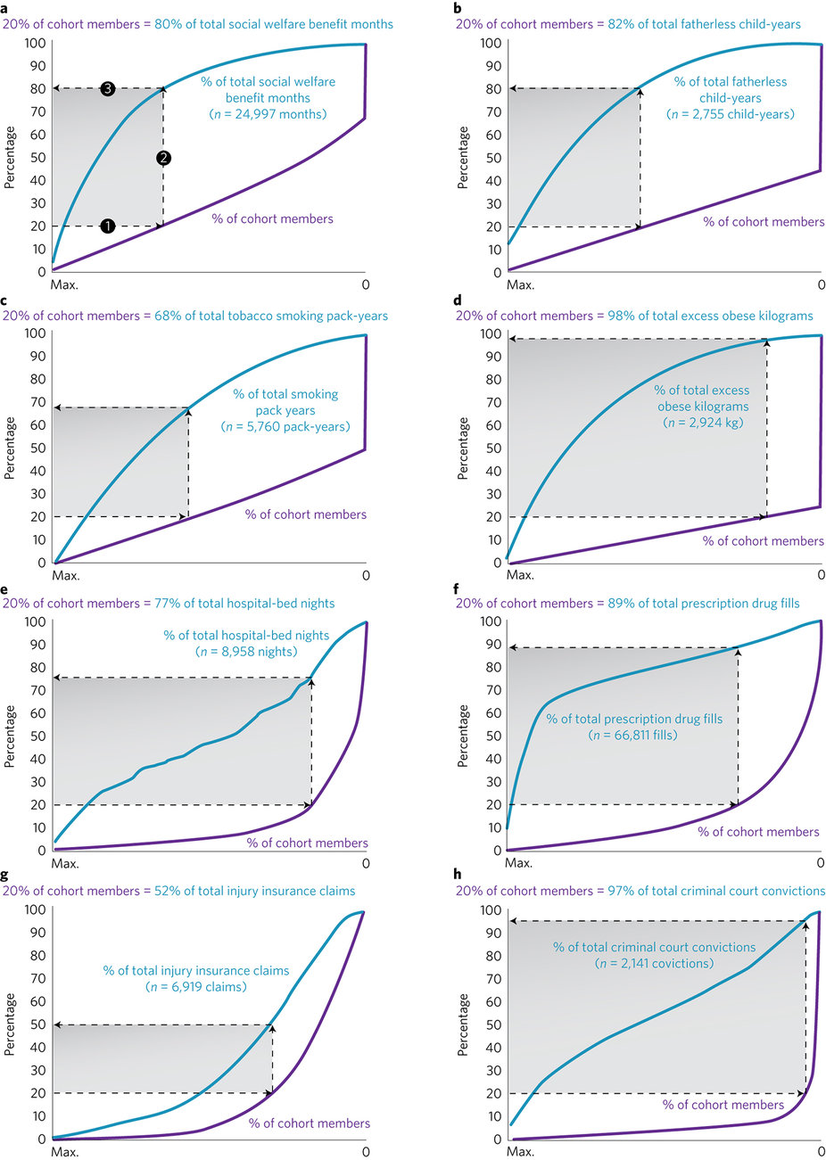 Особенно показательна статистика по уголовным преступлениям: 22% детей совершают 81% всех преступлений, когда вырастут. В общем-то, в таком распределении нет ничего удивительного, потому что оно соответствует распределению Парето в теории вероятностей (20% детей — 80% преступлений). Главное то, что учёным удалось изолировать конкретные факторы для этих 20% детей.